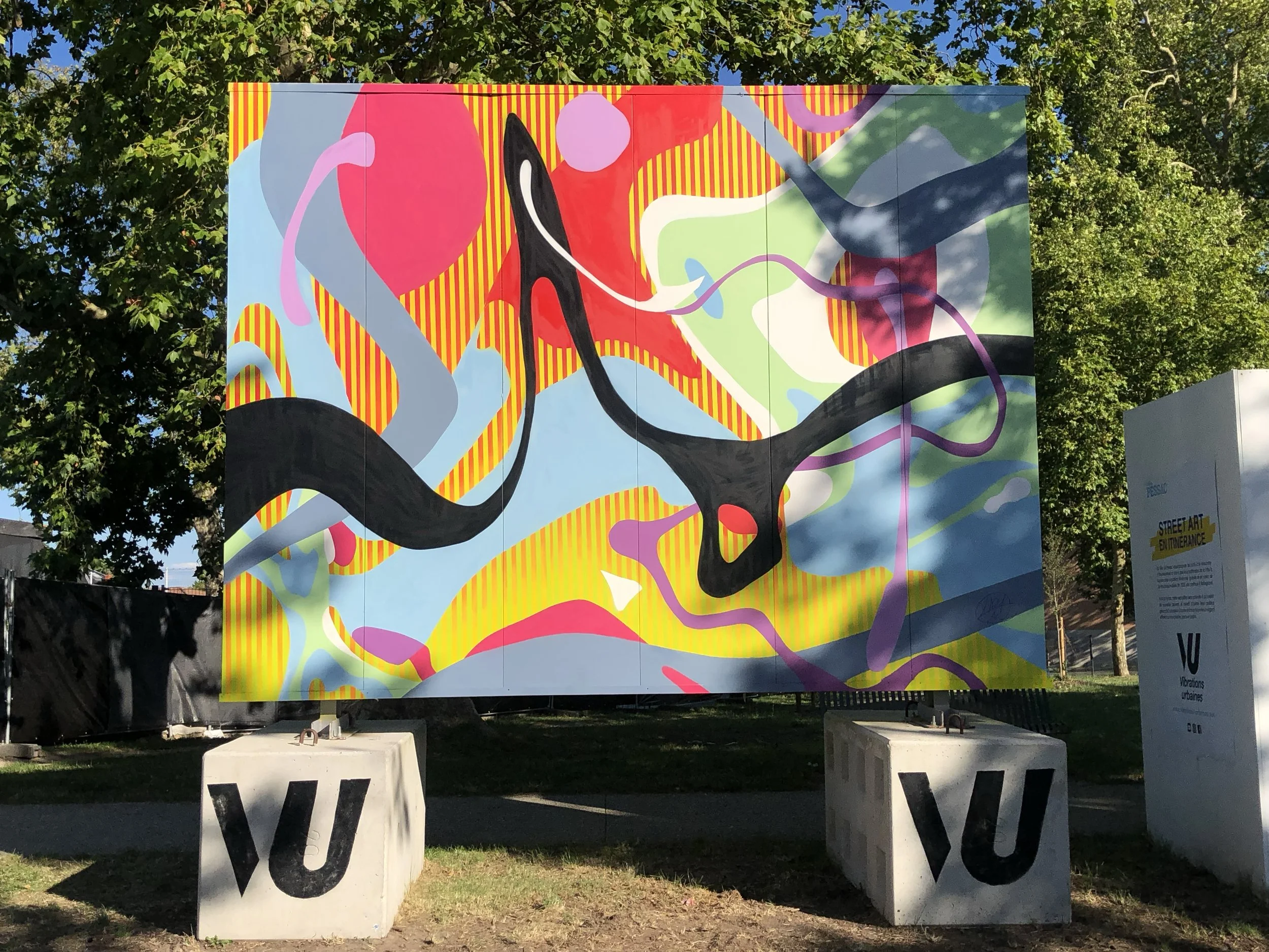 Le festival de musique des vibrations Urbaines de Pessac m’invite à venir peindre en performance à l’entrée du festival. Je crée pour ce projet une fresque dansante et musicale, pleine de vie et de couleurs, les formes dansent et s’enlacent au rythme de la musique.