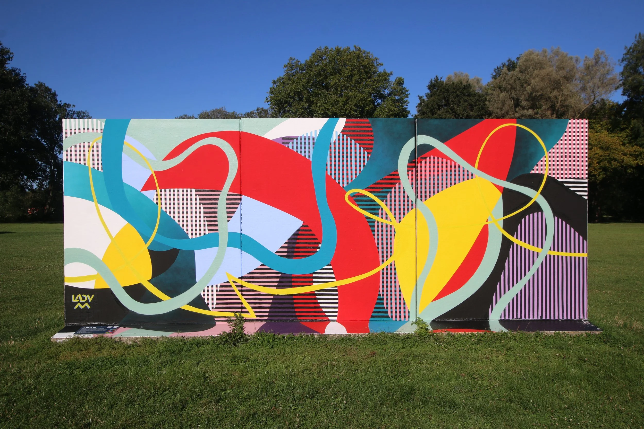 Cette fresque intitulée “Lyrisme”est une collaboration avec l’artiste Speedy Graphito. Notre inspiration est venue de la “musique”, qu'est ce qu’est la musique et que représente t-elle pour nous. Nous avons imaginé des formes qui s’entremêlent avec des couleurs vibrantes comme une partition musicale. Chaque forme évoque un instrument qui compose le rythme de cette œuvre. Cette œuvre devient instantanément l’identité de l’école de musique.