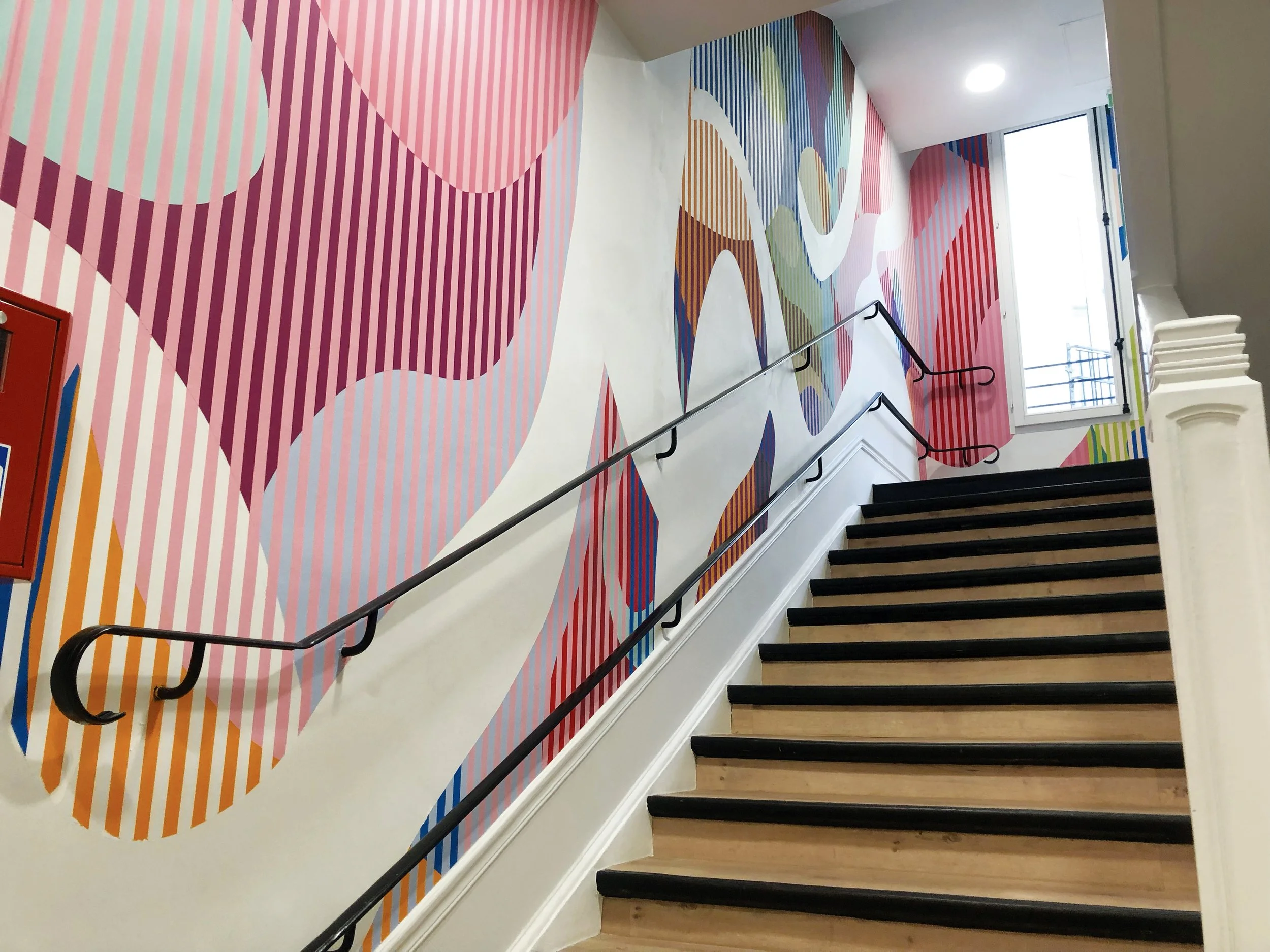 Pour l’école Chardin, je voulais que l'œuvre soit aérienne afin de donner de l’air à cette montée d’escaliers . « Douceur et peps » ont été les deux mots qui m’ont inspiré lorsque j’ai vu les photos du lieu. J’ai choisi de travailler avec une dominante de rose sur la partie du bas pour dialoguer avec la fresque de Speedy Graphito dans le hall de l’école. En arrivant au premier demi-étage les teintes changent et laissent place à des tons vert, bleus en écho avec la nature et ainsi faire le lien avec la cour extérieure des artistes Speedy Graphito et Kan Street pointillisme. Plus on monte cet escalier et plus on va également vers le ciel et nous rejoignons le pays des rêves »